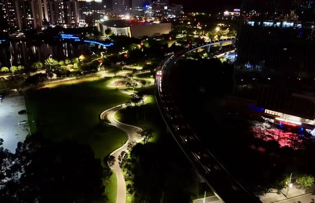 夜幕降临,灯光点亮,不少市民来到此处悠闲散步。此时,地铁四号线列车灯光闪烁、穿梭而过,其声响与绿地夜景交融,成为一道独特的城市背景音。