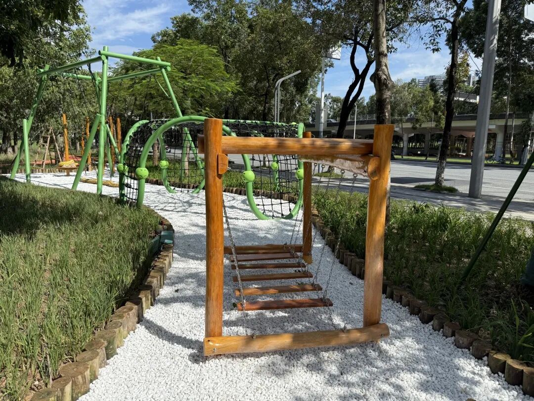 园内,立在“枝头”的小鸟雕塑栩栩如生,仿佛在欢快歌唱,营造出“入园见绿”的惊喜感。此外,木桩造型的城市家具错落有致地分布其中,为过往行人提供了一处静谧的休憩场所。