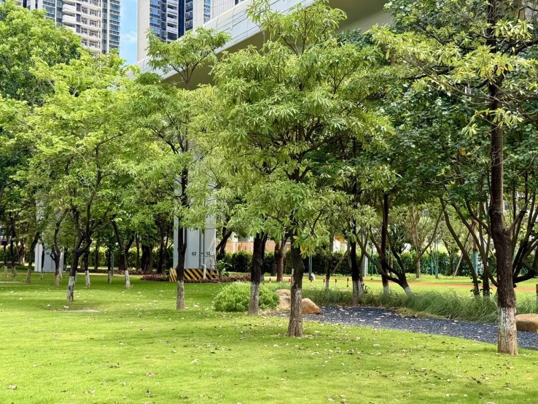 星河cocopark外围绿地的提升改造更是细节满满。沿路绿化更新为低矮灌木与花卉,保留部分原有的树,提升道路视觉通透性与商业界面的亲和力。