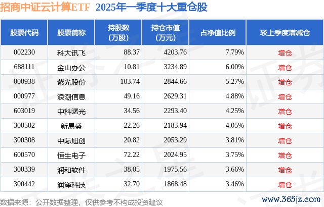 从基金规模来看,招商中证云计算ETF基金2025年一季度公布的基金规模为5.39亿元,较上一期规模1.69亿元变化了3.71亿元,环比变化了219.74%。该基金最新一期资产配置为:股票占净值比98.84%,无债券类资产,现金占净值比1.19%。从基金持仓来看天盈资本,该基金当季前十大股票仓位达46.92%,第一大重仓股为科大讯飞(002230),持仓占比为7.79%。