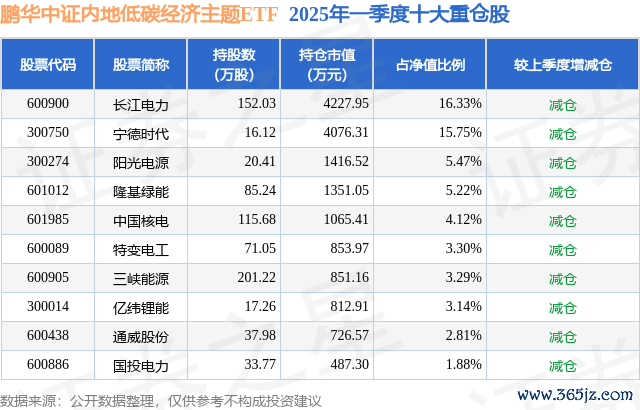 从基金规模来看奕汇网,鹏华中证内地低碳经济主题ETF基金2025年一季度公布的基金规模为2.59亿元,较上一期规模2.91亿元变化了-3227.73万元,环比变化了-11.09%。该基金最新一期资产配置为:股票占净值比99.18%,无债券类资产,现金占净值比0.81%。从基金持仓来看,该基金当季前十大股票仓位达61.31%,第一大重仓股为长江电力(600900),持仓占比为16.33%。