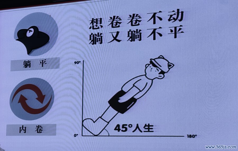 想卷,又卷不动;想躺,又躺不平,为何现在有不少年轻人会为“45°人生”焦虑?当一张这样的漫画出现在大屏幕上时,全场的高中生笑了。
